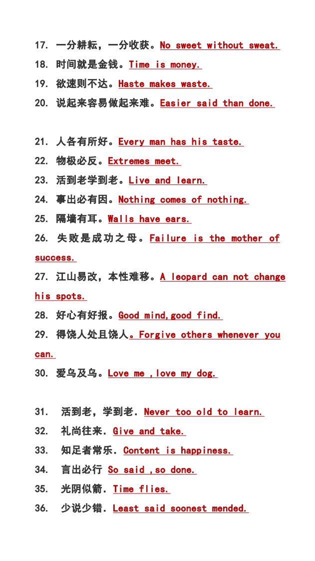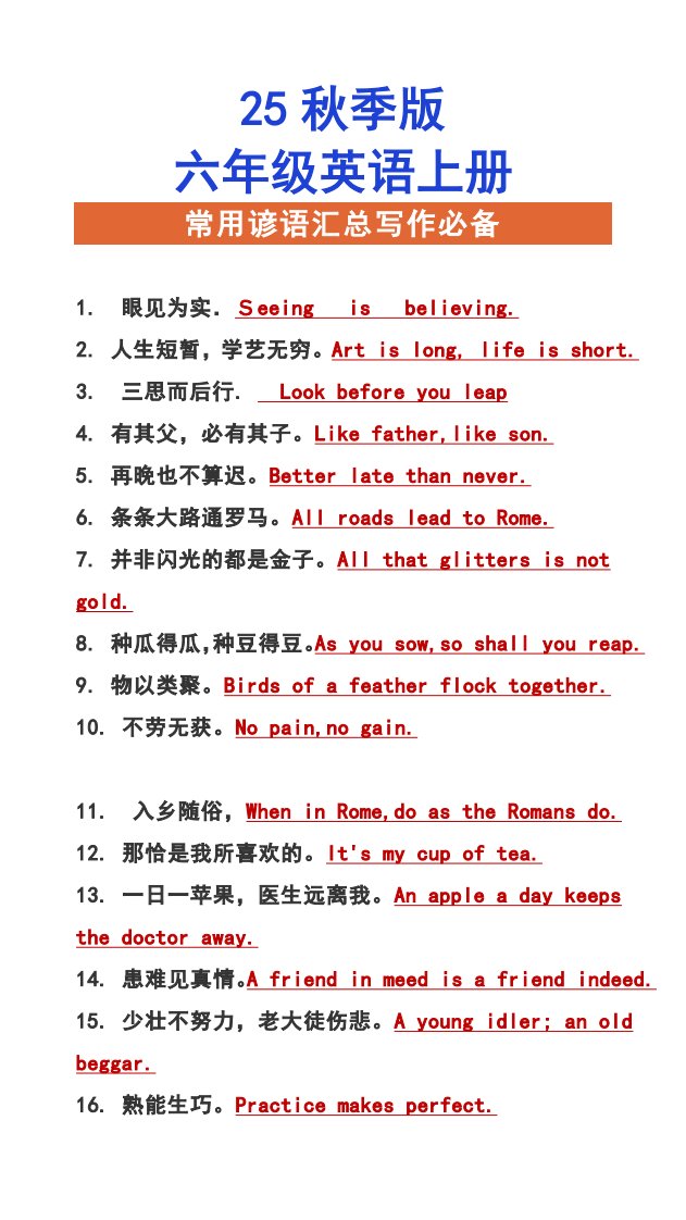 【2025秋新版】六年级上册英语常用谚语汇总写作必备_共3页