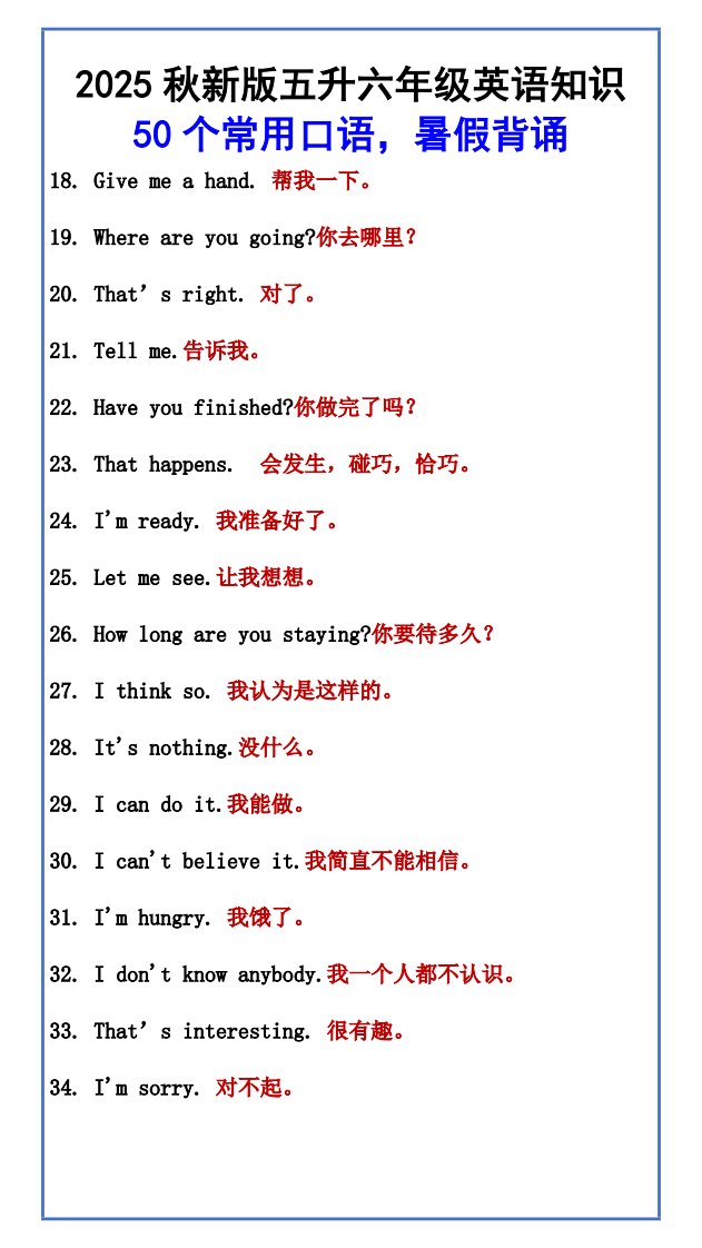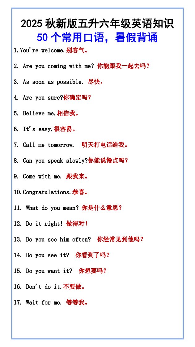 当前位置: 首页小学资源小学六年级正文 【2025秋新版】五升六年级英语知识50个常用口语,暑假背诵-六上英语_共4页 小学六年级 7 天前 0 0 5 以上为部分内容预览,如需源文档请登录您的会员账号进行下载! 声明:本站所有文章,如无特殊说明或标注,均为本站原创发布。任何个人或组织,在未征得本站同意时,禁止复制、盗用、采集、发布本站内容到任何网站、书籍等各类媒体平台。如若本站内容侵犯了原著者的合法权益,可联系我们进行处理。 尚学资源永久会员 打赏 收藏 海报 链接