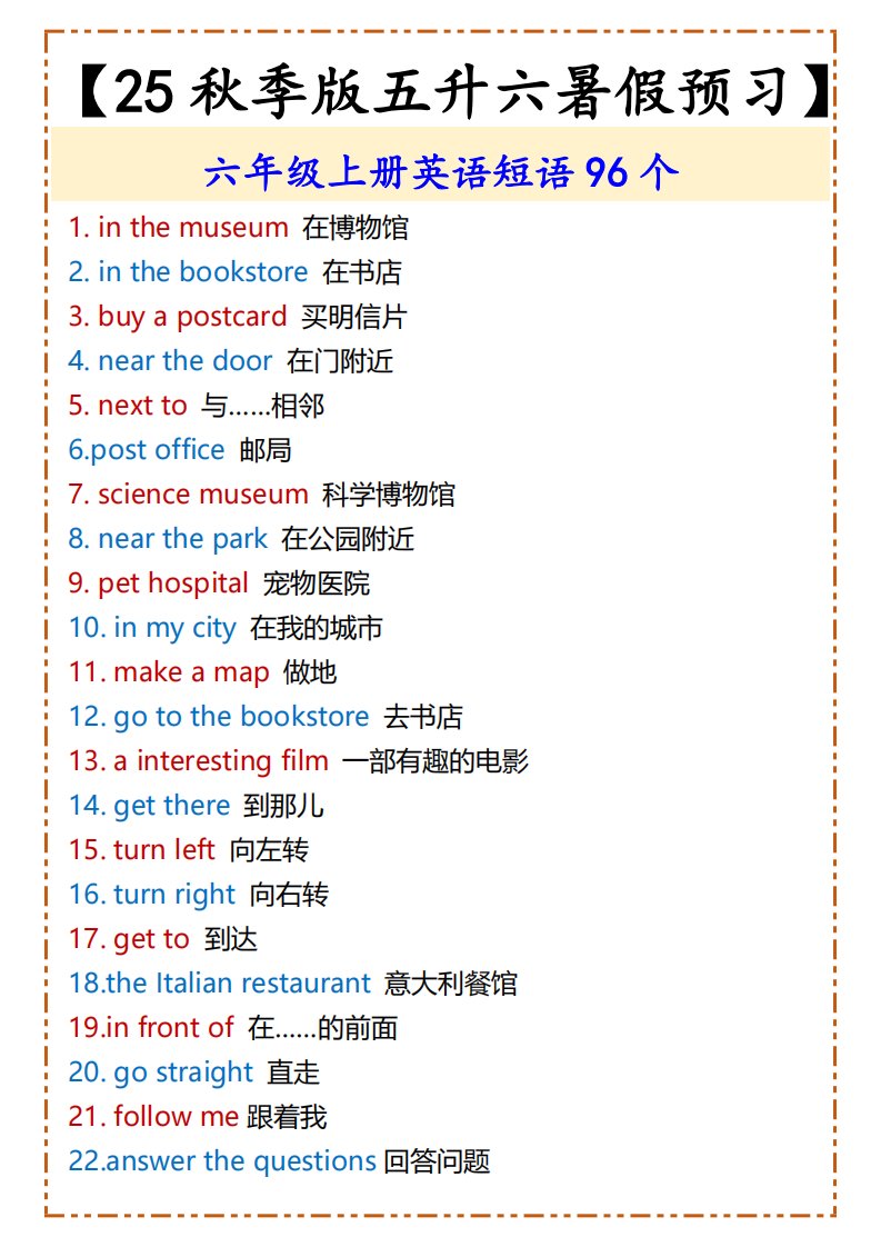 当前位置: 首页小学资源小学六年级正文 【2025秋新版】六年级上册英语短语96个_共4页 小学六年级 7 天前 0 0 5 以上为部分内容预览,如需源文档请登录您的会员账号进行下载! 声明:本站所有文章,如无特殊说明或标注,均为本站原创发布。任何个人或组织,在未征得本站同意时,禁止复制、盗用、采集、发布本站内容到任何网站、书籍等各类媒体平台。如若本站内容侵犯了原著者的合法权益,可联系我们进行处理。 尚学资源永久会员 打赏 收藏 海报 链接
