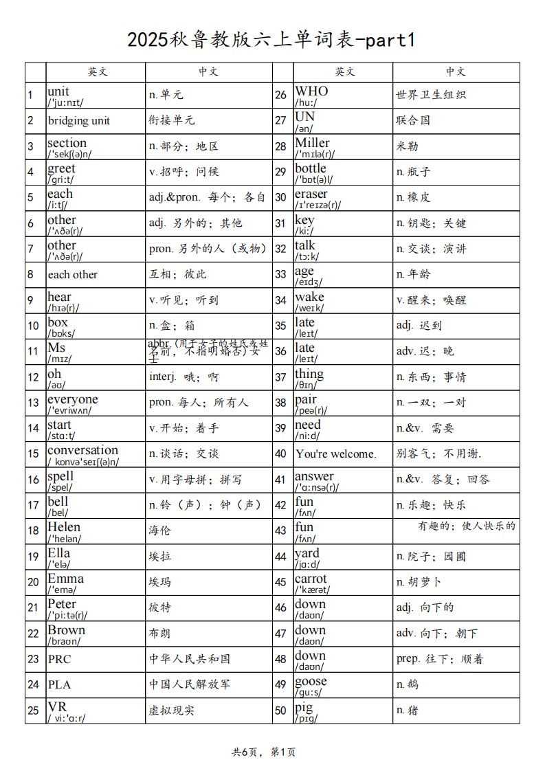 当前位置: 首页小学资源小学六年级正文 2025秋鲁教版六上英语单词表-part1_共6页 小学六年级 6 天前 0 0 5 以上为部分内容预览,如需源文档请登录您的会员账号进行下载! 声明:本站所有文章,如无特殊说明或标注,均为本站原创发布。任何个人或组织,在未征得本站同意时,禁止复制、盗用、采集、发布本站内容到任何网站、书籍等各类媒体平台。如若本站内容侵犯了原著者的合法权益,可联系我们进行处理。 尚学资源永久会员 打赏 收藏 海报 链接