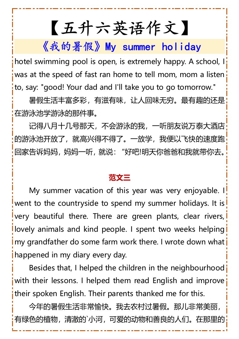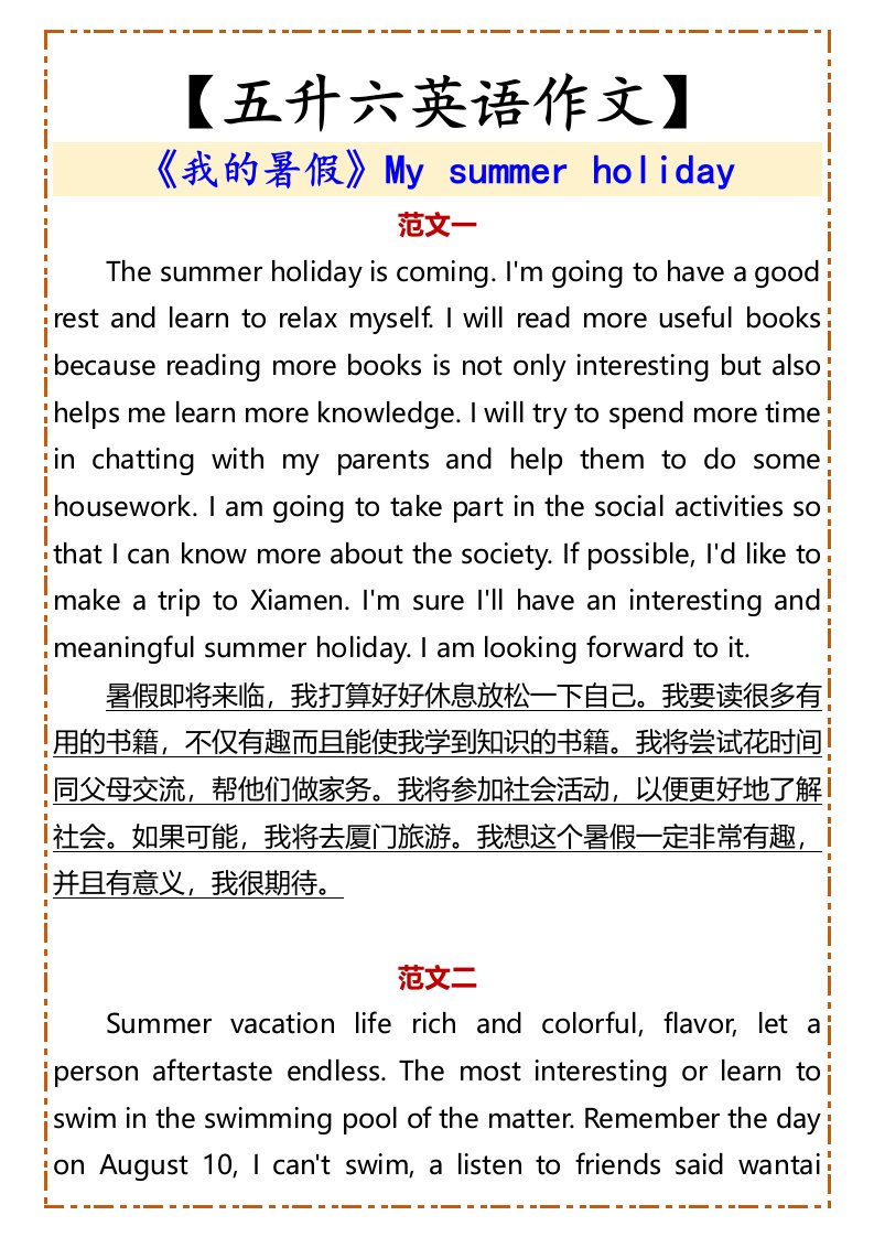 当前位置: 首页小学资源小学六年级正文 【五升六英语作文】《我的暑假》-六上英语_共3页 小学六年级 6 天前 0 0 5 以上为部分内容预览,如需源文档请登录您的会员账号进行下载! 声明:本站所有文章,如无特殊说明或标注,均为本站原创发布。任何个人或组织,在未征得本站同意时,禁止复制、盗用、采集、发布本站内容到任何网站、书籍等各类媒体平台。如若本站内容侵犯了原著者的合法权益,可联系我们进行处理。 尚学资源永久会员 打赏 收藏 海报 链接