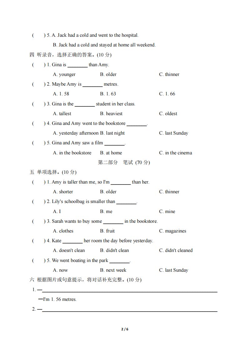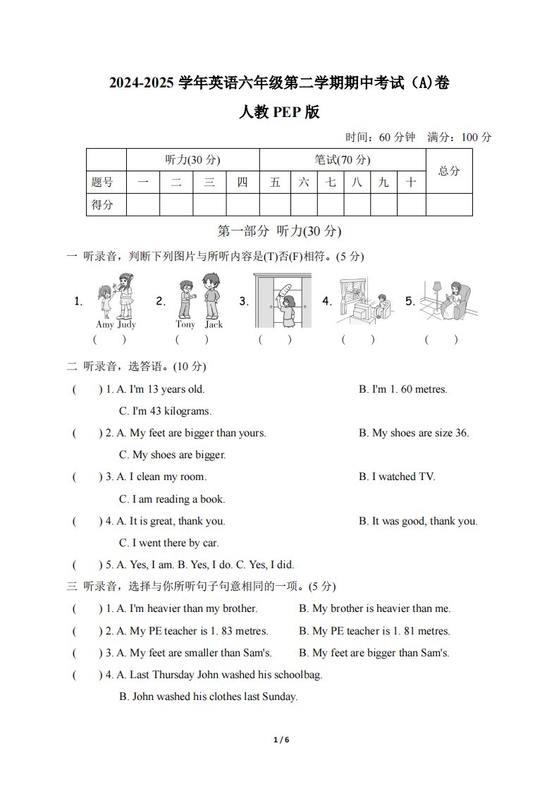 当前位置: 首页小学资源小学六年级正文 人教版2024-2025学年英语六年级第二学期期中考试(A)卷_共6页 小学六年级 6 天前 0 0 5 以上为部分内容预览,如需源文档请登录您的会员账号进行下载! 声明:本站所有文章,如无特殊说明或标注,均为本站原创发布。任何个人或组织,在未征得本站同意时,禁止复制、盗用、采集、发布本站内容到任何网站、书籍等各类媒体平台。如若本站内容侵犯了原著者的合法权益,可联系我们进行处理。 尚学资源永久会员 打赏 收藏 海报 链接