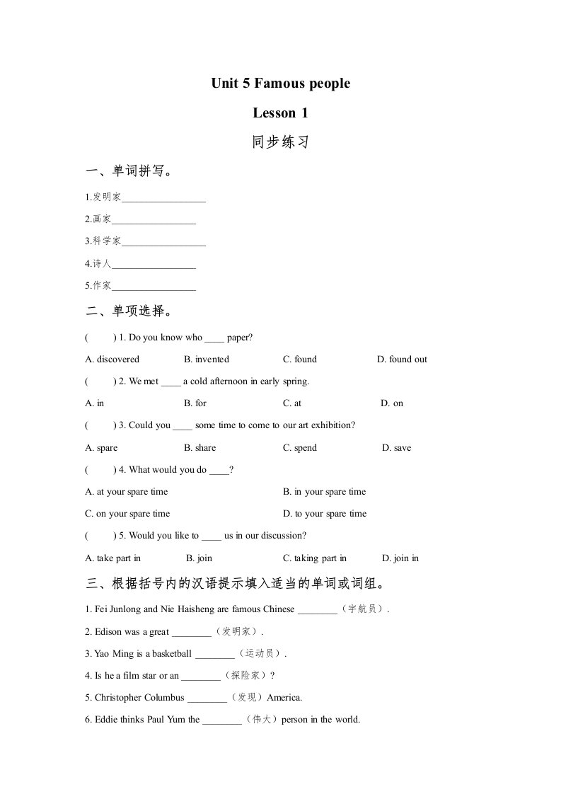 当前位置: 首页小学资源小学六年级正文 六年级英语上册Unit5FamousPeopleLesson1同步练习3(人教版一起点)_共3页 小学六年级 6 天前 0 0 5 以上为部分内容预览,如需源文档请登录您的会员账号进行下载! 声明:本站所有文章,如无特殊说明或标注,均为本站原创发布。任何个人或组织,在未征得本站同意时,禁止复制、盗用、采集、发布本站内容到任何网站、书籍等各类媒体平台。如若本站内容侵犯了原著者的合法权益,可联系我们进行处理。 尚学资源永久会员 打赏 收藏 海报 链接