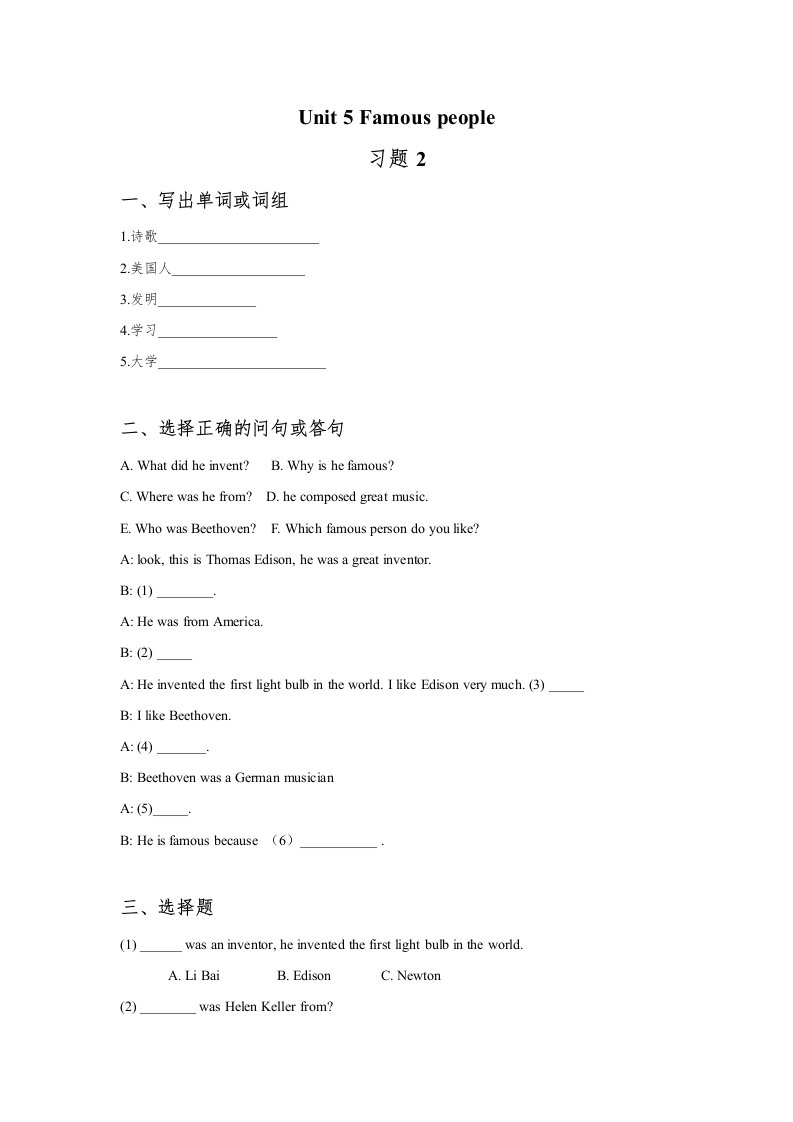 当前位置: 首页小学资源小学六年级正文 六年级英语上册Unit5Famous.people习题2(人教版一起点)_共2页 小学六年级 6 天前 0 0 5 以上为部分内容预览,如需源文档请登录您的会员账号进行下载! 声明:本站所有文章,如无特殊说明或标注,均为本站原创发布。任何个人或组织,在未征得本站同意时,禁止复制、盗用、采集、发布本站内容到任何网站、书籍等各类媒体平台。如若本站内容侵犯了原著者的合法权益,可联系我们进行处理。 尚学资源永久会员 打赏 收藏 海报 链接