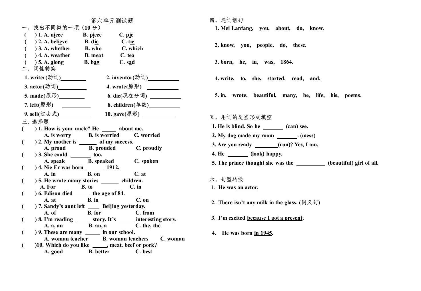 六年级英语上册第六单元测试题(人教版一起点)_共2页