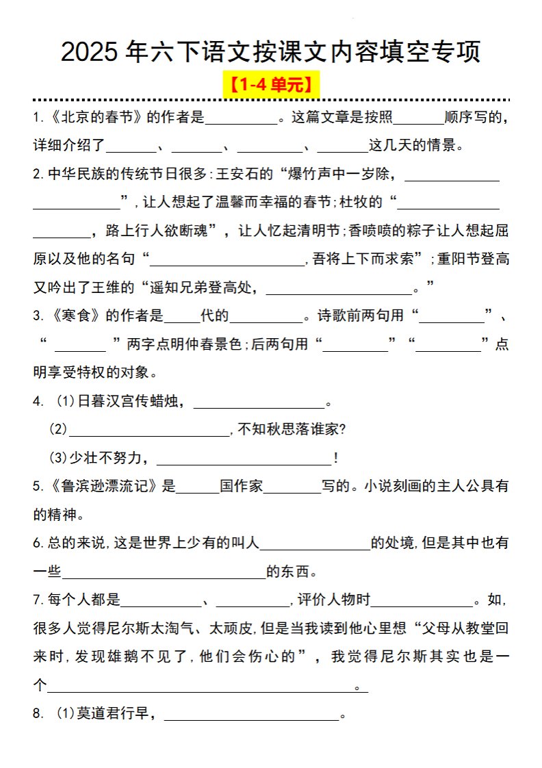 当前位置: 首页小学资源小学六年级正文 2025年六下语文按课文内容填空专项(1-4单元)_共8页 小学六年级 7 天前 0 0 5 以上为部分内容预览,如需源文档请登录您的会员账号进行下载! 声明:本站所有文章,如无特殊说明或标注,均为本站原创发布。任何个人或组织,在未征得本站同意时,禁止复制、盗用、采集、发布本站内容到任何网站、书籍等各类媒体平台。如若本站内容侵犯了原著者的合法权益,可联系我们进行处理。 尚学资源永久会员 打赏 收藏 海报 链接