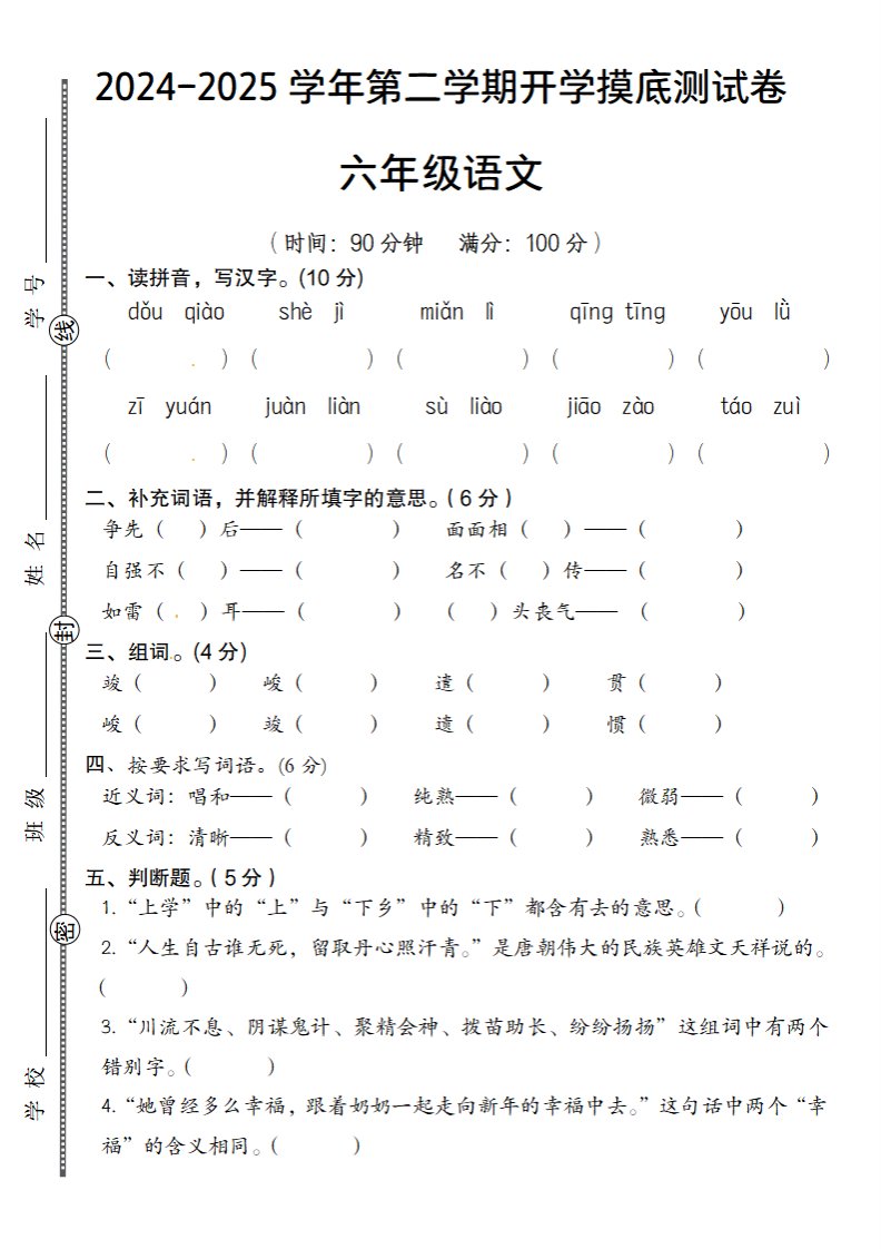 六下语文2024-2025学年第二学期开学摸底测试卷_共5页