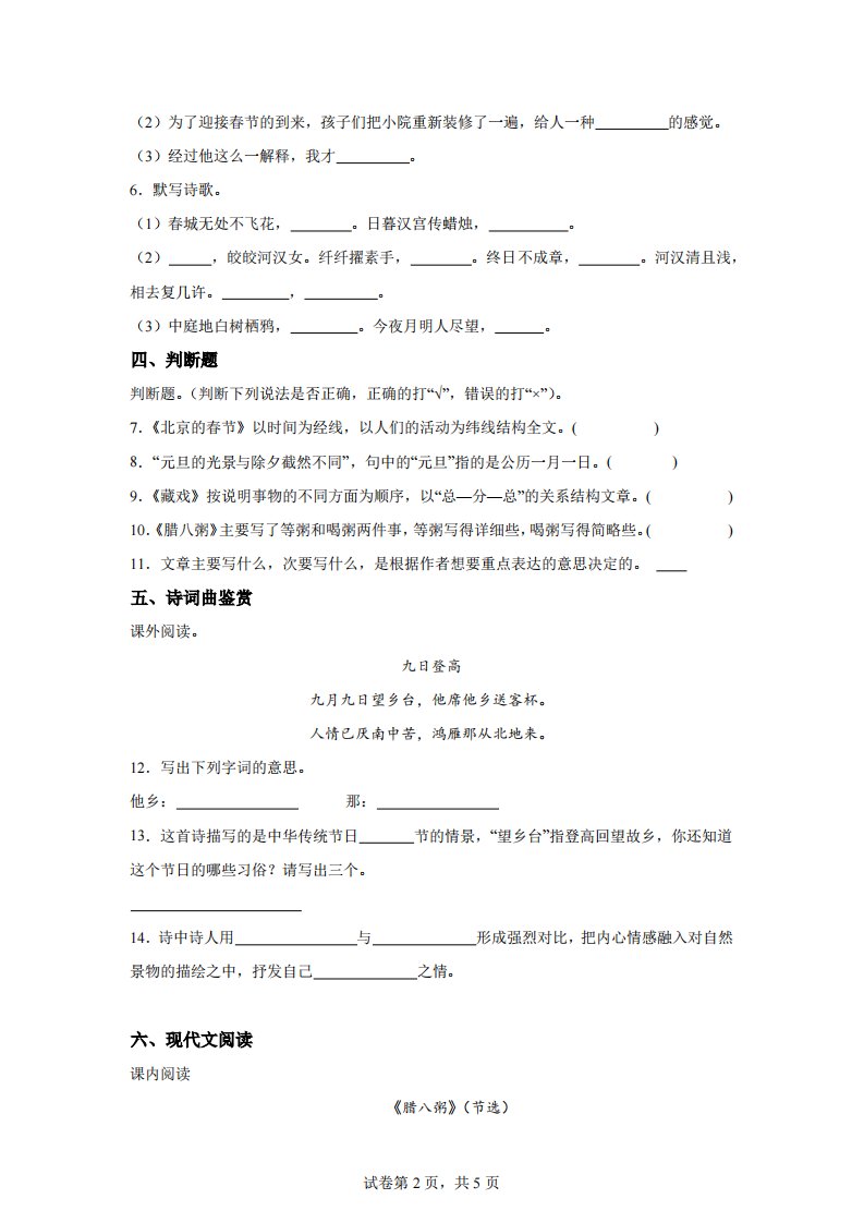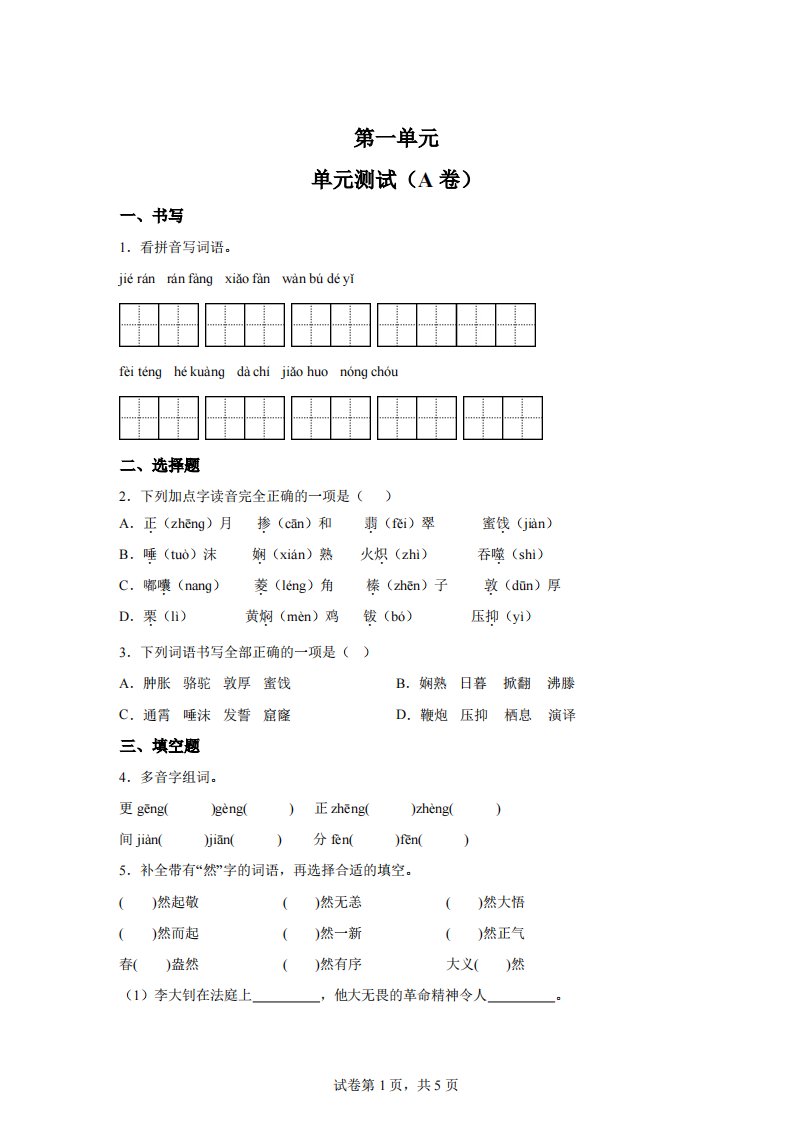 【试卷】六下语文第一单元单元测试(A卷)_共12页