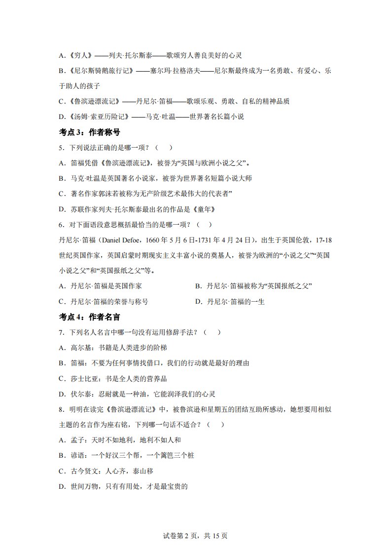当前位置: 首页小学资源小学六年级正文 【阅读】统编版语文六年级下册整本书阅读:鲁滨逊漂流记_共35页 小学六年级 6 天前 0 0 15 以上为部分内容预览,如需源文档请登录您的会员账号进行下载! 声明:本站所有文章,如无特殊说明或标注,均为本站原创发布。任何个人或组织,在未征得本站同意时,禁止复制、盗用、采集、发布本站内容到任何网站、书籍等各类媒体平台。如若本站内容侵犯了原著者的合法权益,可联系我们进行处理。 尚学资源永久会员 打赏 收藏 海报 链接