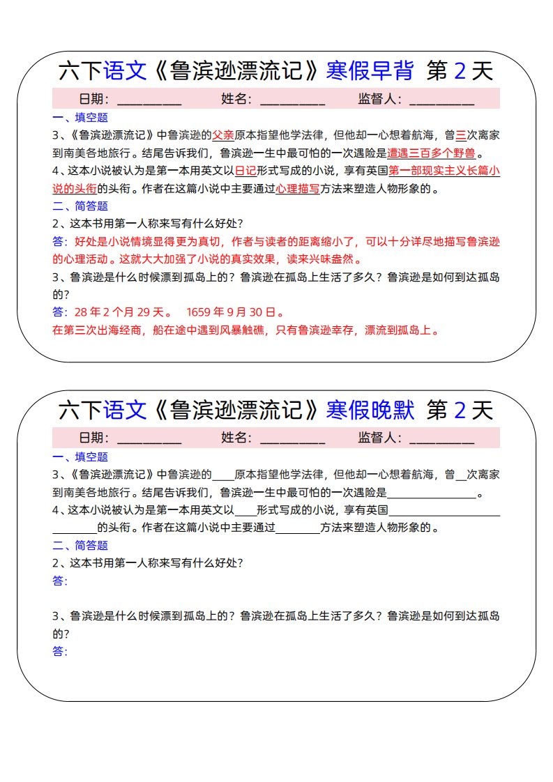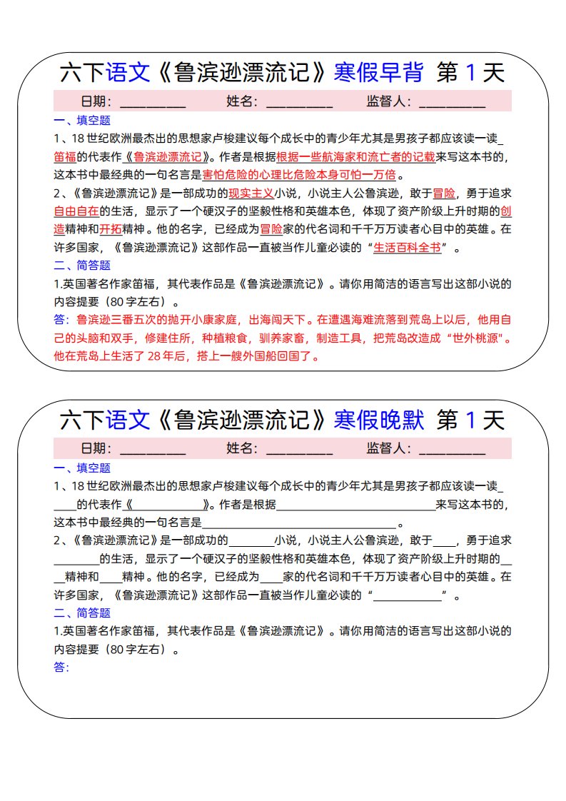 当前位置: 首页小学资源小学六年级正文 六下语文《鲁滨逊漂流记》寒假早背晚默(15天)_共15页 小学六年级 6 天前 0 0 10 以上为部分内容预览,如需源文档请登录您的会员账号进行下载! 声明:本站所有文章,如无特殊说明或标注,均为本站原创发布。任何个人或组织,在未征得本站同意时,禁止复制、盗用、采集、发布本站内容到任何网站、书籍等各类媒体平台。如若本站内容侵犯了原著者的合法权益,可联系我们进行处理。 尚学资源永久会员 打赏 收藏 海报 链接