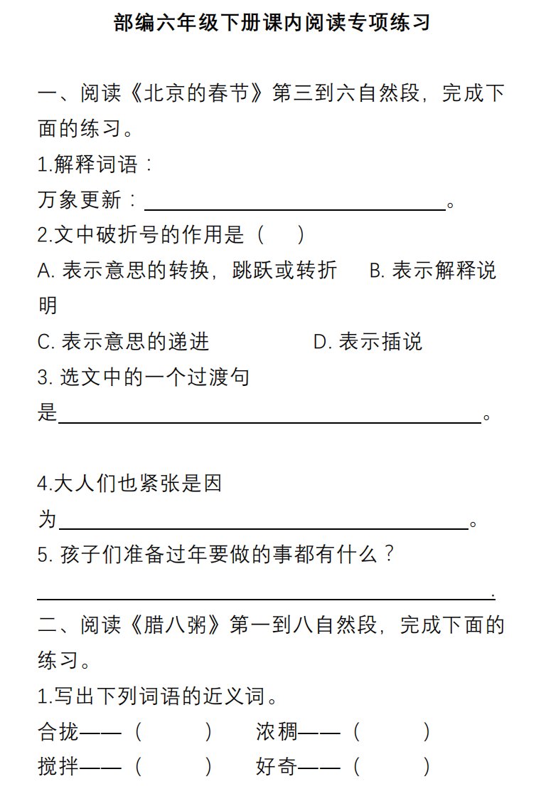 当前位置: 首页小学资源小学六年级正文 部编版六年级语文下册课内阅读理解专项_共12页 小学六年级 6 天前 0 0 10 以上为部分内容预览,如需源文档请登录您的会员账号进行下载! 声明:本站所有文章,如无特殊说明或标注,均为本站原创发布。任何个人或组织,在未征得本站同意时,禁止复制、盗用、采集、发布本站内容到任何网站、书籍等各类媒体平台。如若本站内容侵犯了原著者的合法权益,可联系我们进行处理。 尚学资源永久会员 打赏 收藏 海报 链接