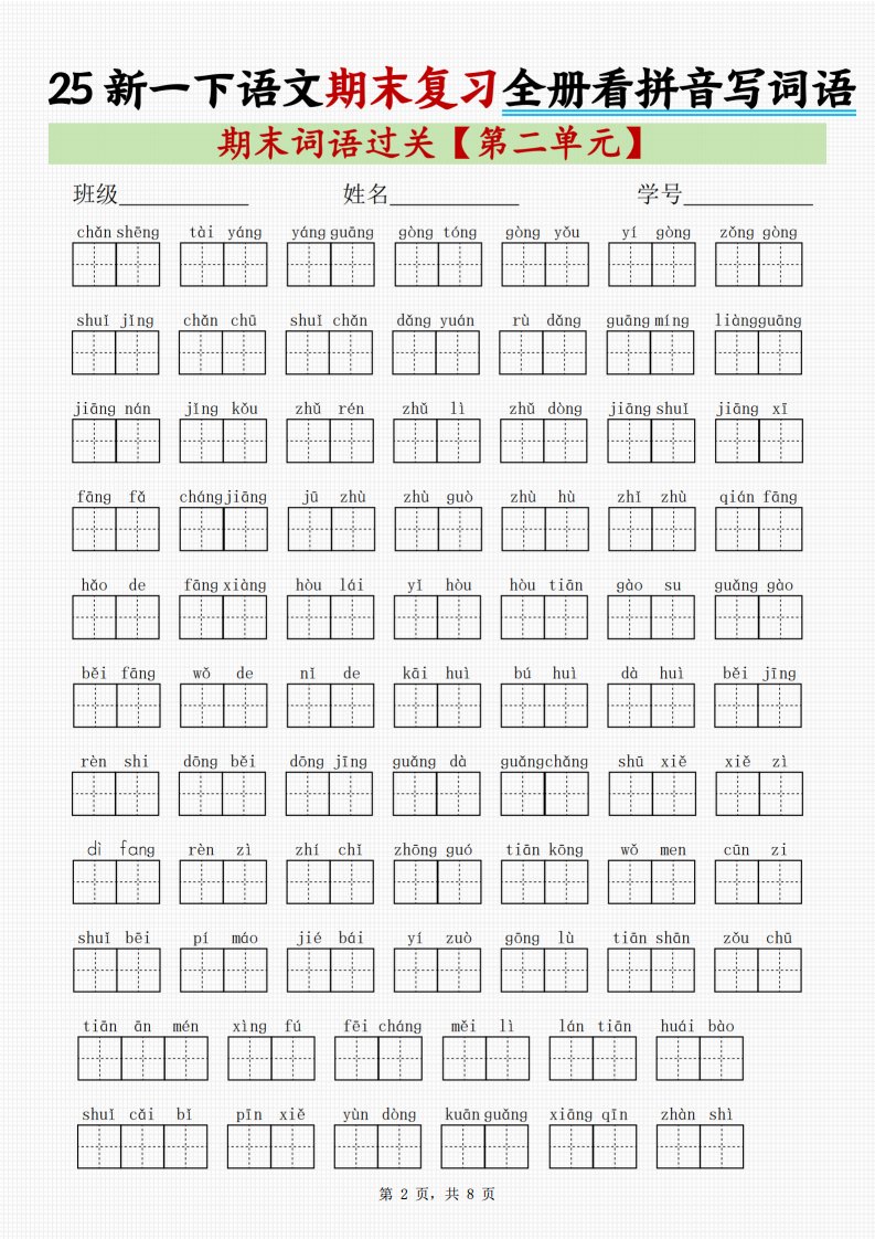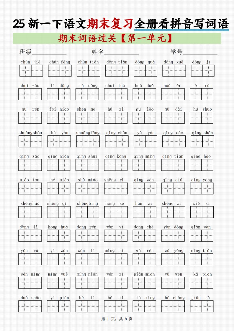25新一下语文期末复习全册1-8单元看拼音写词语(8页)_共8页
