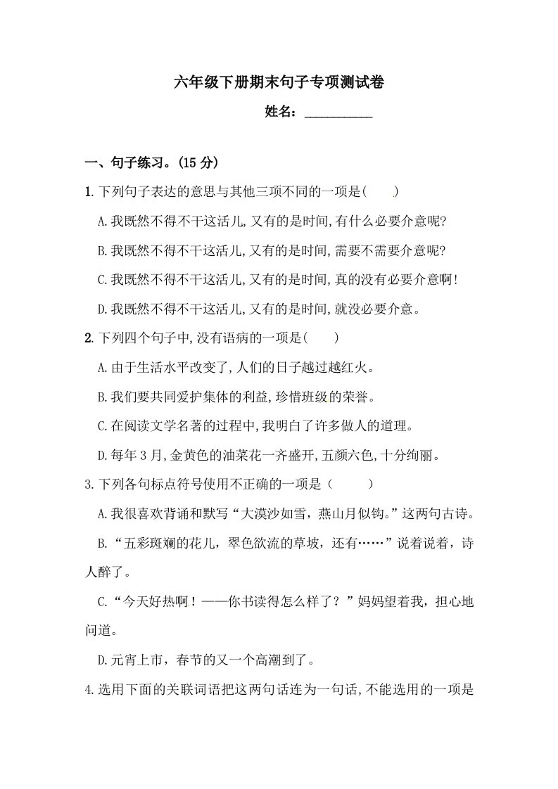 当前位置: 首页小学资源小学六年级正文 六年级语文下册期末句子专项测试卷(二)(含答案)(部编版)_共7页 小学六年级 6 天前 0 0 5 以上为部分内容预览,如需源文档请登录您的会员账号进行下载! 声明:本站所有文章,如无特殊说明或标注,均为本站原创发布。任何个人或组织,在未征得本站同意时,禁止复制、盗用、采集、发布本站内容到任何网站、书籍等各类媒体平台。如若本站内容侵犯了原著者的合法权益,可联系我们进行处理。 尚学资源永久会员 打赏 收藏 海报 链接