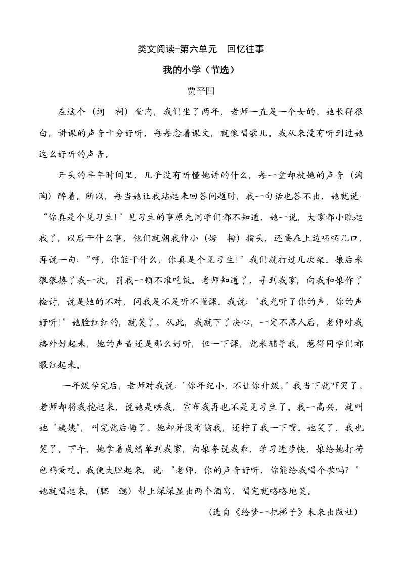当前位置: 首页小学资源小学六年级正文 六年级语文下册类文阅读-第六单元回忆往事_共5页 小学六年级 6 天前 0 0 5 以上为部分内容预览,如需源文档请登录您的会员账号进行下载! 声明:本站所有文章,如无特殊说明或标注,均为本站原创发布。任何个人或组织,在未征得本站同意时,禁止复制、盗用、采集、发布本站内容到任何网站、书籍等各类媒体平台。如若本站内容侵犯了原著者的合法权益,可联系我们进行处理。 尚学资源永久会员 打赏 收藏 海报 链接