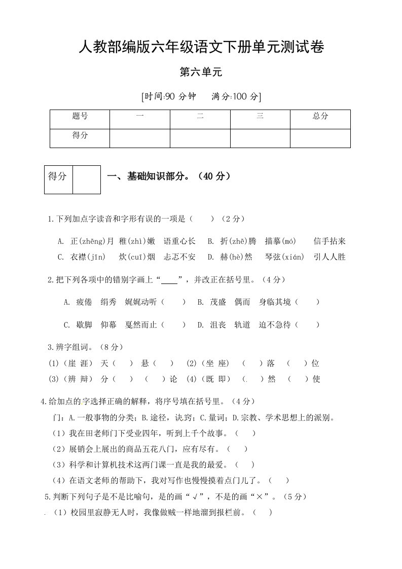 当前位置: 首页小学资源小学六年级正文 六年级语文下册人教部编版第6单元测试卷1(有答案)_共8页 小学六年级 6 天前 0 0 5 以上为部分内容预览,如需源文档请登录您的会员账号进行下载! 声明:本站所有文章,如无特殊说明或标注,均为本站原创发布。任何个人或组织,在未征得本站同意时,禁止复制、盗用、采集、发布本站内容到任何网站、书籍等各类媒体平台。如若本站内容侵犯了原著者的合法权益,可联系我们进行处理。 尚学资源永久会员 打赏 收藏 海报 链接