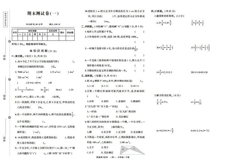当前位置: 首页小学资源小学六年级正文 西师六下数学期末测试卷_共2页 小学六年级 6 天前 0 0 5 以上为部分内容预览,如需源文档请登录您的会员账号进行下载! 声明:本站所有文章,如无特殊说明或标注,均为本站原创发布。任何个人或组织,在未征得本站同意时,禁止复制、盗用、采集、发布本站内容到任何网站、书籍等各类媒体平台。如若本站内容侵犯了原著者的合法权益,可联系我们进行处理。 尚学资源永久会员 打赏 收藏 海报 链接