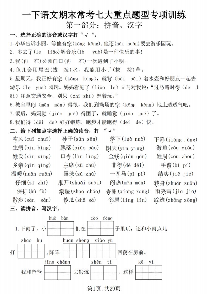 【25学年-期末复习常考七大重点题型专项练习29页】一下语文_共29页