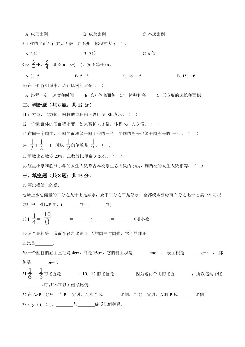 西师小学六年级下册期中考试数学试卷1(含解析)_共13页