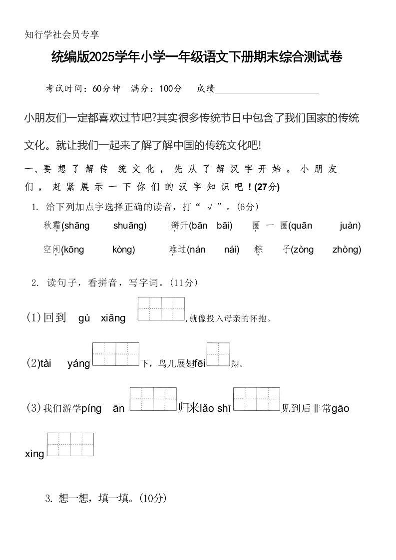 统编版2025学年小学一年级语文下册期末综合测试卷_共6页