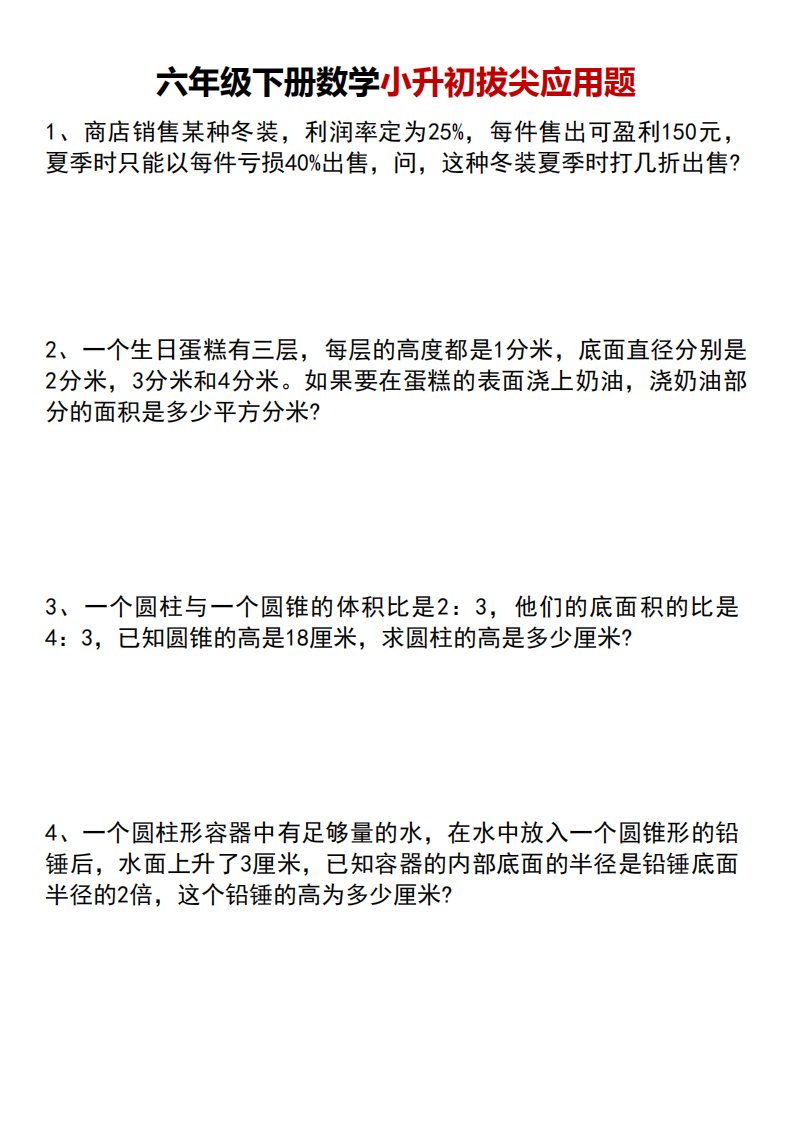 当前位置: 首页小学资源小学六年级正文 六年级下册数学小升初专项拔尖应用题_共8页 小学六年级 6 天前 0 0 5 以上为部分内容预览,如需源文档请登录您的会员账号进行下载! 声明:本站所有文章,如无特殊说明或标注,均为本站原创发布。任何个人或组织,在未征得本站同意时,禁止复制、盗用、采集、发布本站内容到任何网站、书籍等各类媒体平台。如若本站内容侵犯了原著者的合法权益,可联系我们进行处理。 尚学资源永久会员 打赏 收藏 海报 链接