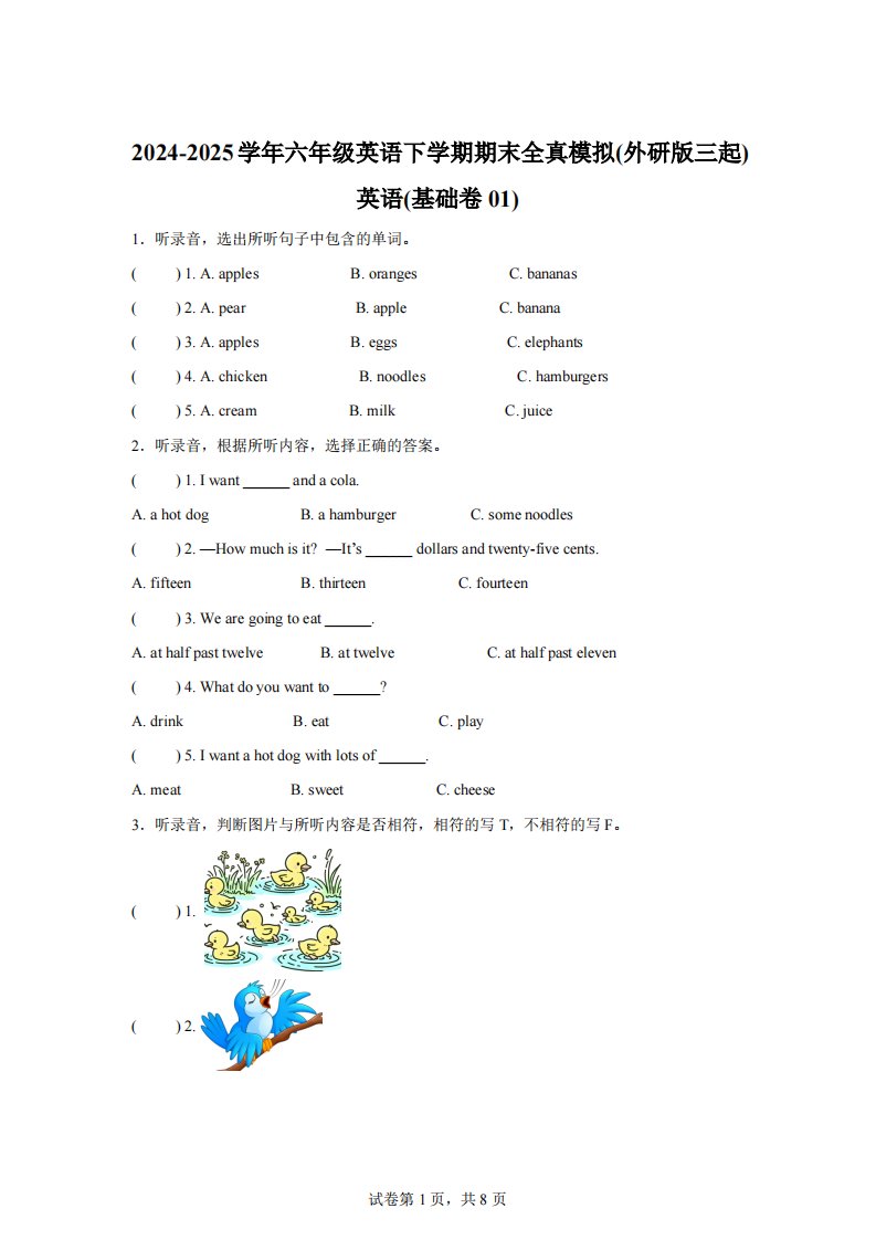 2024-2025学年六年级英语下学期期末全真模拟(外研版三起)英语(基础卷01)_共14页