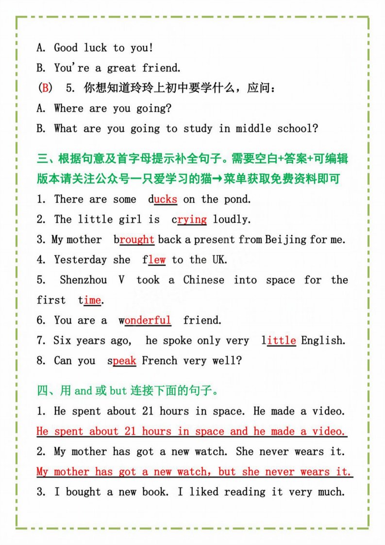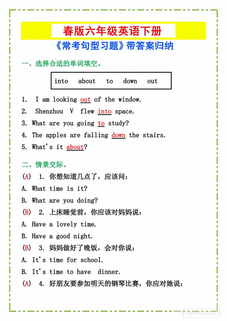 当前位置: 首页小学资源小学六年级正文 六年级下英语《常考句型习题》_共4页 小学六年级 6 天前 0 0 5 以上为部分内容预览,如需源文档请登录您的会员账号进行下载! 声明:本站所有文章,如无特殊说明或标注,均为本站原创发布。任何个人或组织,在未征得本站同意时,禁止复制、盗用、采集、发布本站内容到任何网站、书籍等各类媒体平台。如若本站内容侵犯了原著者的合法权益,可联系我们进行处理。 尚学资源永久会员 打赏 收藏 海报 链接