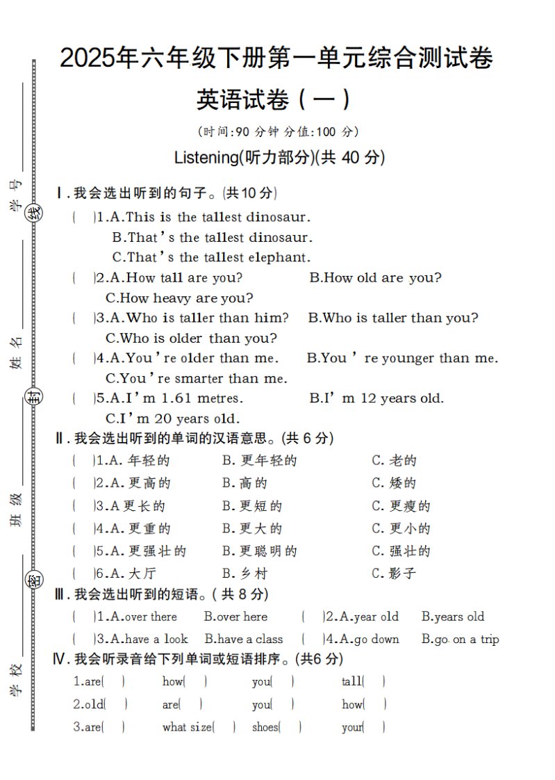 当前位置: 首页小学资源小学六年级正文 【英语】【人教pep版】2025年六年级下册第一单元综合测试卷英语试卷(一)_共4页 小学六年级 6 天前 0 0 5 以上为部分内容预览,如需源文档请登录您的会员账号进行下载! 声明:本站所有文章,如无特殊说明或标注,均为本站原创发布。任何个人或组织,在未征得本站同意时,禁止复制、盗用、采集、发布本站内容到任何网站、书籍等各类媒体平台。如若本站内容侵犯了原著者的合法权益,可联系我们进行处理。 尚学资源永久会员 打赏 收藏 海报 链接