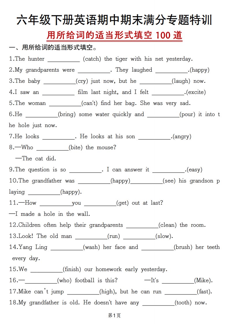 六下英语《满分专题特训一用所给词的适当形式填空100道》_共7页