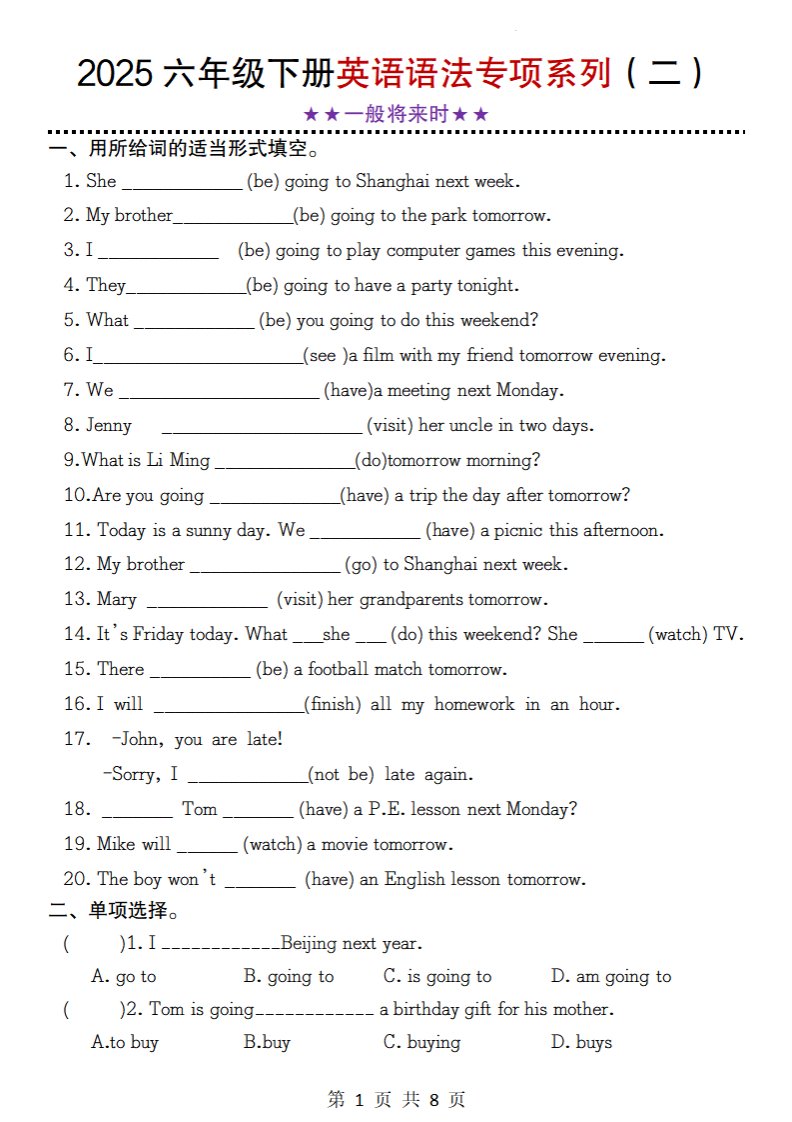 当前位置: 首页小学资源小学六年级正文 【2-24】【英语】2025六年级下册英语语法专项系列(二)★★一般将来时★★_共8页 小学六年级 6 天前 0 0 5 以上为部分内容预览,如需源文档请登录您的会员账号进行下载! 声明:本站所有文章,如无特殊说明或标注,均为本站原创发布。任何个人或组织,在未征得本站同意时,禁止复制、盗用、采集、发布本站内容到任何网站、书籍等各类媒体平台。如若本站内容侵犯了原著者的合法权益,可联系我们进行处理。 尚学资源永久会员 打赏 收藏 海报 链接
