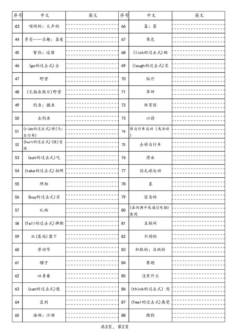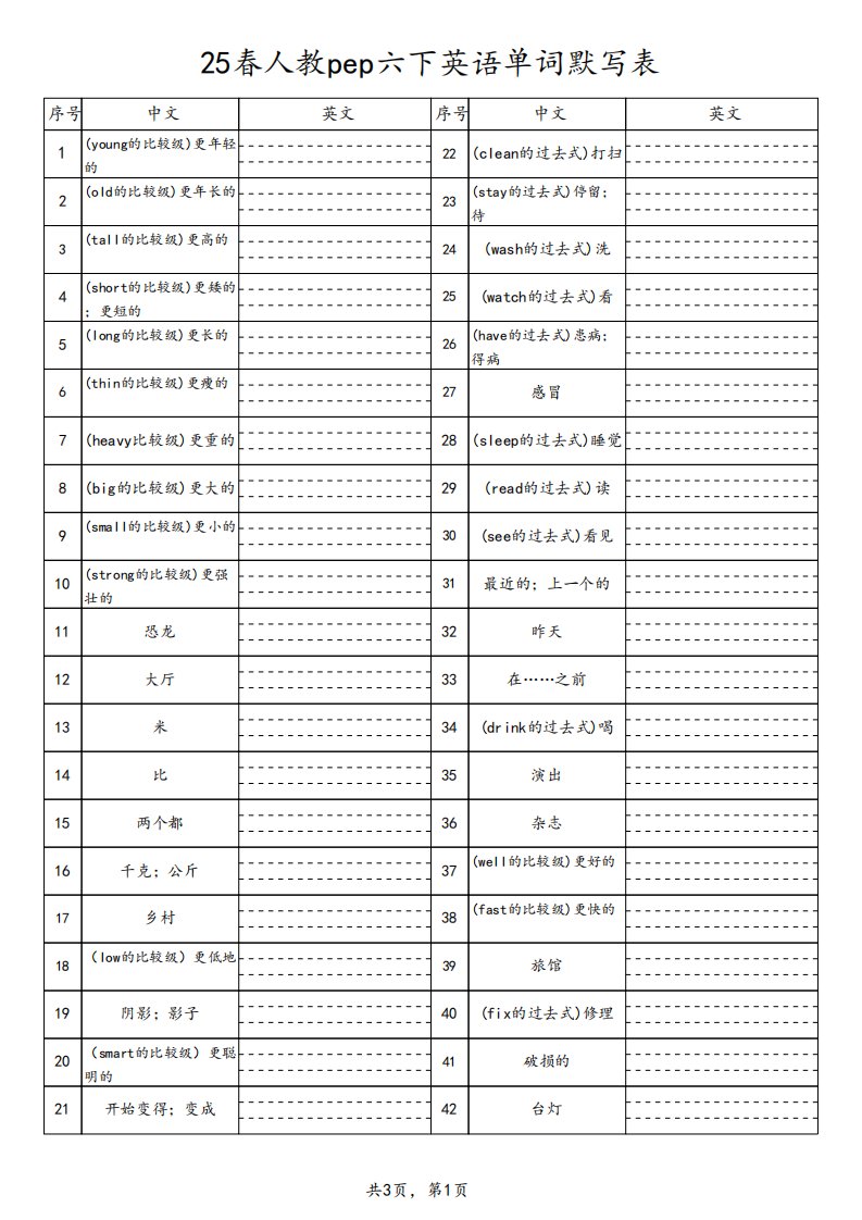 当前位置: 首页小学资源小学六年级正文 【默写】25春人教pep六下英语单词默写表(3页)_共3页 小学六年级 6 天前 0 0 5 以上为部分内容预览,如需源文档请登录您的会员账号进行下载! 声明:本站所有文章,如无特殊说明或标注,均为本站原创发布。任何个人或组织,在未征得本站同意时,禁止复制、盗用、采集、发布本站内容到任何网站、书籍等各类媒体平台。如若本站内容侵犯了原著者的合法权益,可联系我们进行处理。 尚学资源永久会员 打赏 收藏 海报 链接