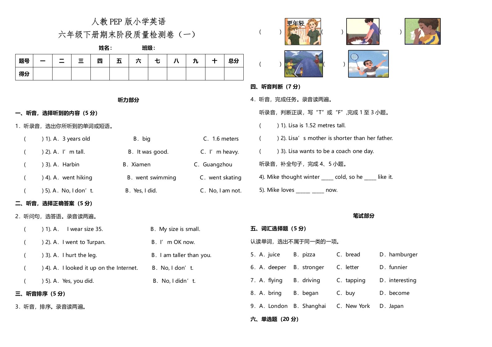 当前位置: 首页小学资源小学六年级正文 六年级英语下册人教PEP版期末阶段质量检测卷(一)(含参考答案)_共6页 小学六年级 5 天前 0 0 5 以上为部分内容预览,如需源文档请登录您的会员账号进行下载! 声明:本站所有文章,如无特殊说明或标注,均为本站原创发布。任何个人或组织,在未征得本站同意时,禁止复制、盗用、采集、发布本站内容到任何网站、书籍等各类媒体平台。如若本站内容侵犯了原著者的合法权益,可联系我们进行处理。 尚学资源永久会员 打赏 收藏 海报 链接