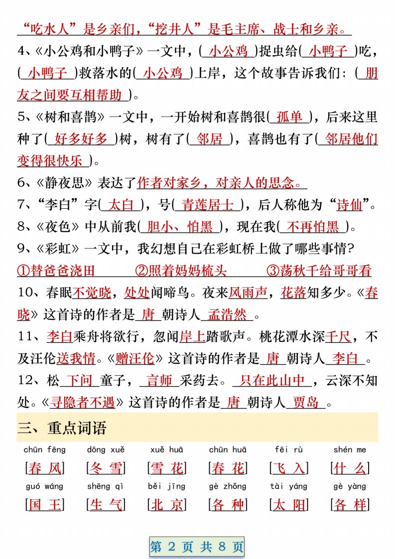 一年级语文下册期中重要考点知识汇总(8页)_共8页