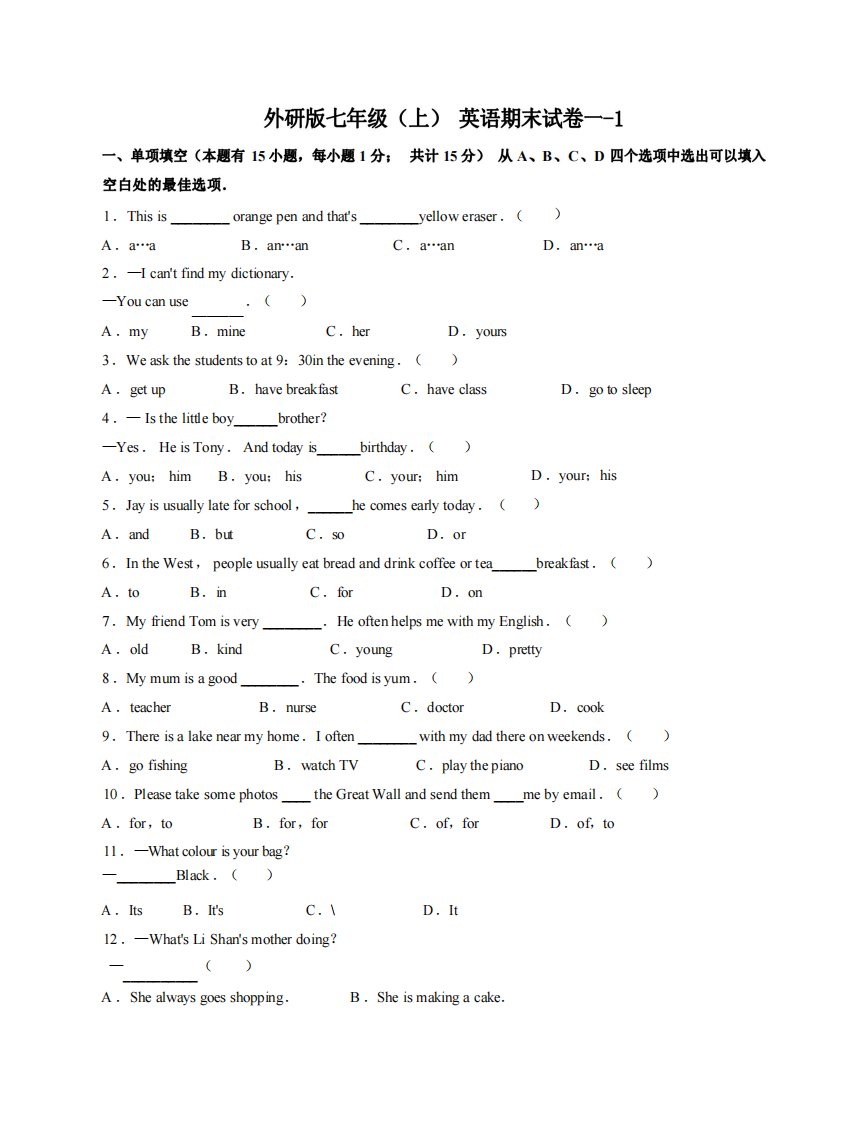 当前位置: 首页初中资源初中七年级正文 七年级(上)英语期末试卷1-1卷外研版_共6页 初中七年级 5 天前 0 0 5 以上为部分内容预览,如需源文档请登录您的会员账号进行下载! 声明:本站所有文章,如无特殊说明或标注,均为本站原创发布。任何个人或组织,在未征得本站同意时,禁止复制、盗用、采集、发布本站内容到任何网站、书籍等各类媒体平台。如若本站内容侵犯了原著者的合法权益,可联系我们进行处理。 尚学资源永久会员 打赏 收藏 海报 链接