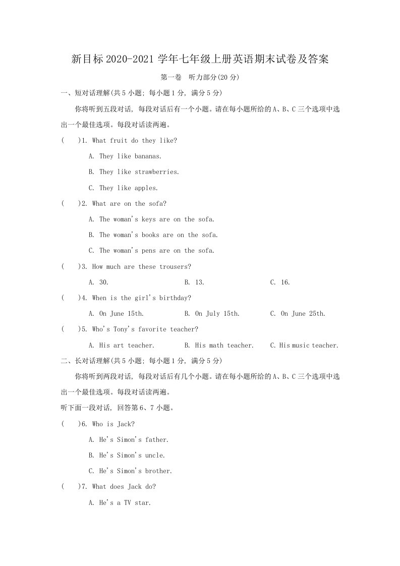当前位置: 首页初中资源初中七年级正文 新目标2020-2021学年七年级上册英语期末试卷及答案(Word版)_共15页 初中七年级 5 天前 0 0 10 以上为部分内容预览,如需源文档请登录您的会员账号进行下载! 声明:本站所有文章,如无特殊说明或标注,均为本站原创发布。任何个人或组织,在未征得本站同意时,禁止复制、盗用、采集、发布本站内容到任何网站、书籍等各类媒体平台。如若本站内容侵犯了原著者的合法权益,可联系我们进行处理。 尚学资源永久会员 打赏 收藏 海报 链接