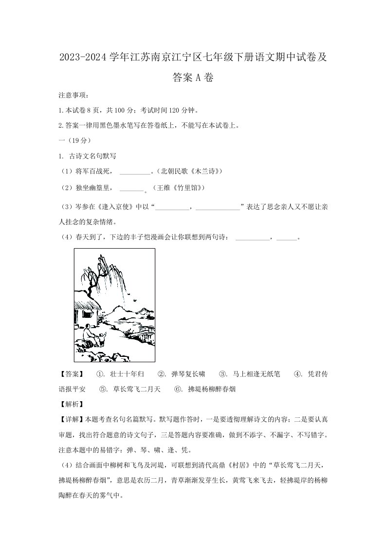 2023-2024学年江苏南京江宁区七年级下册语文期中试卷及答案A卷(Word版)_共16页