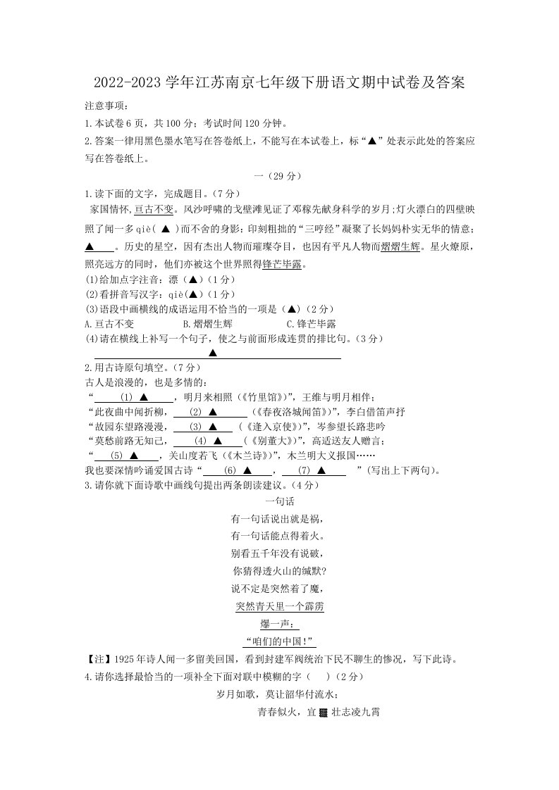 当前位置: 首页初中资源初中七年级正文 2022-2023学年江苏南京七年级下册语文期中试卷及答案(Word版)_共8页 初中七年级 4 天前 0 0 5 以上为部分内容预览,如需源文档请登录您的会员账号进行下载! 声明:本站所有文章,如无特殊说明或标注,均为本站原创发布。任何个人或组织,在未征得本站同意时,禁止复制、盗用、采集、发布本站内容到任何网站、书籍等各类媒体平台。如若本站内容侵犯了原著者的合法权益,可联系我们进行处理。 尚学资源永久会员 打赏 收藏 海报 链接