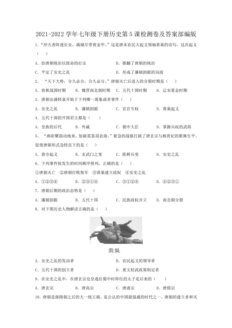2021-2022学年七年级下册历史第5课检测卷及答案部编版(Word版)_共10页