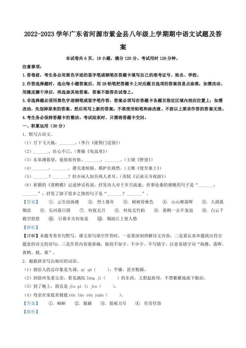 当前位置: 首页初中资源初中八年级正文 2022-2023学年广东省河源市紫金县八年级上学期期中语文试题及答案(Word版)_共14页 初中八年级 4 天前 0 0 10 以上为部分内容预览,如需源文档请登录您的会员账号进行下载! 声明:本站所有文章,如无特殊说明或标注,均为本站原创发布。任何个人或组织,在未征得本站同意时,禁止复制、盗用、采集、发布本站内容到任何网站、书籍等各类媒体平台。如若本站内容侵犯了原著者的合法权益,可联系我们进行处理。 尚学资源永久会员 打赏 收藏 海报 链接