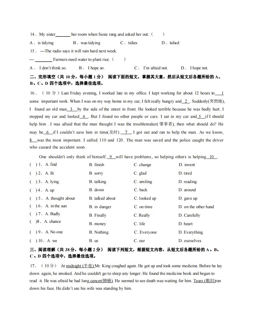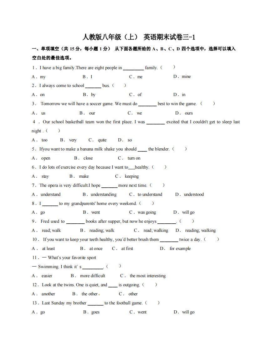 当前位置: 首页初中资源初中八年级正文 八年级(上)英语期末试卷3-1卷人教版_共8页 初中八年级 5 天前 0 0 5 以上为部分内容预览,如需源文档请登录您的会员账号进行下载! 声明:本站所有文章,如无特殊说明或标注,均为本站原创发布。任何个人或组织,在未征得本站同意时,禁止复制、盗用、采集、发布本站内容到任何网站、书籍等各类媒体平台。如若本站内容侵犯了原著者的合法权益,可联系我们进行处理。 尚学资源永久会员 打赏 收藏 海报 链接