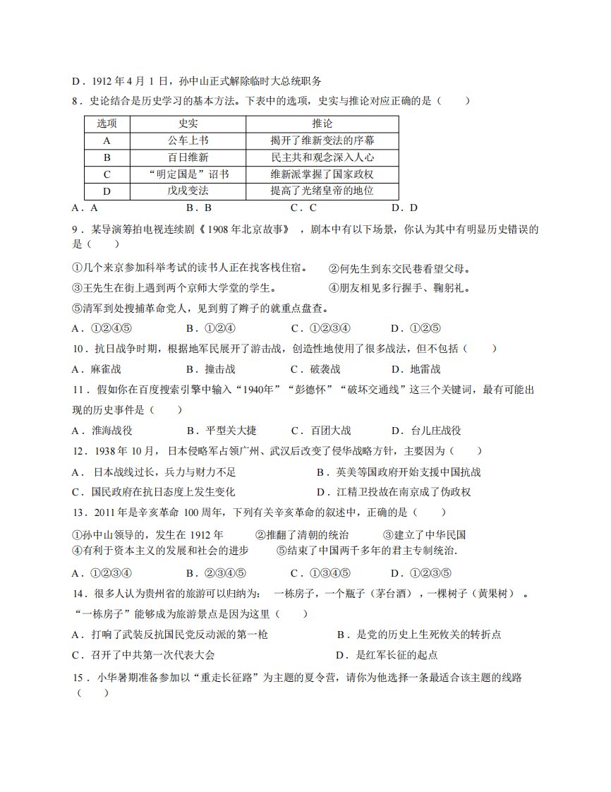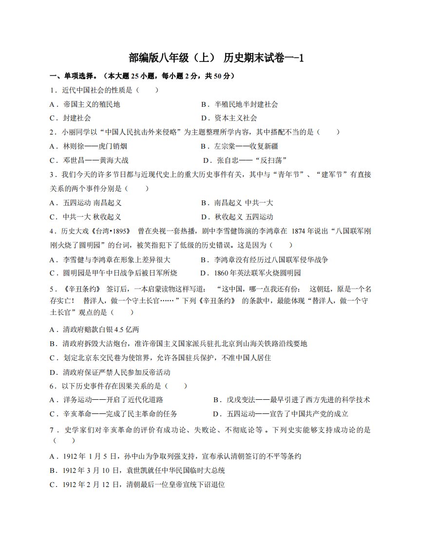 八年级(上)历史期末试卷1-1卷部编版_共9页
