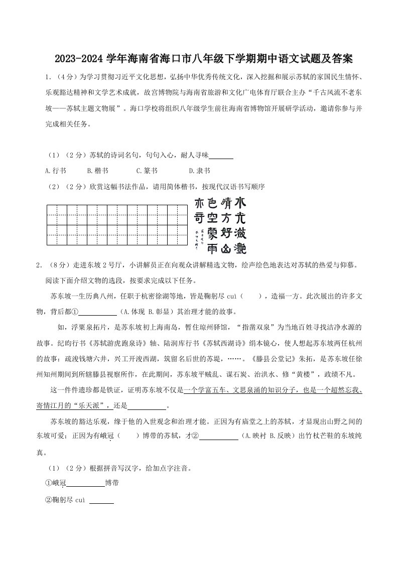 当前位置: 首页初中资源初中八年级正文 2023-2024学年海南省海口市八年级下学期期中语文试题及答案(Word版)_共16页 初中八年级 4 天前 0 0 10 以上为部分内容预览,如需源文档请登录您的会员账号进行下载! 声明:本站所有文章,如无特殊说明或标注,均为本站原创发布。任何个人或组织,在未征得本站同意时,禁止复制、盗用、采集、发布本站内容到任何网站、书籍等各类媒体平台。如若本站内容侵犯了原著者的合法权益,可联系我们进行处理。 尚学资源永久会员 打赏 收藏 海报 链接
