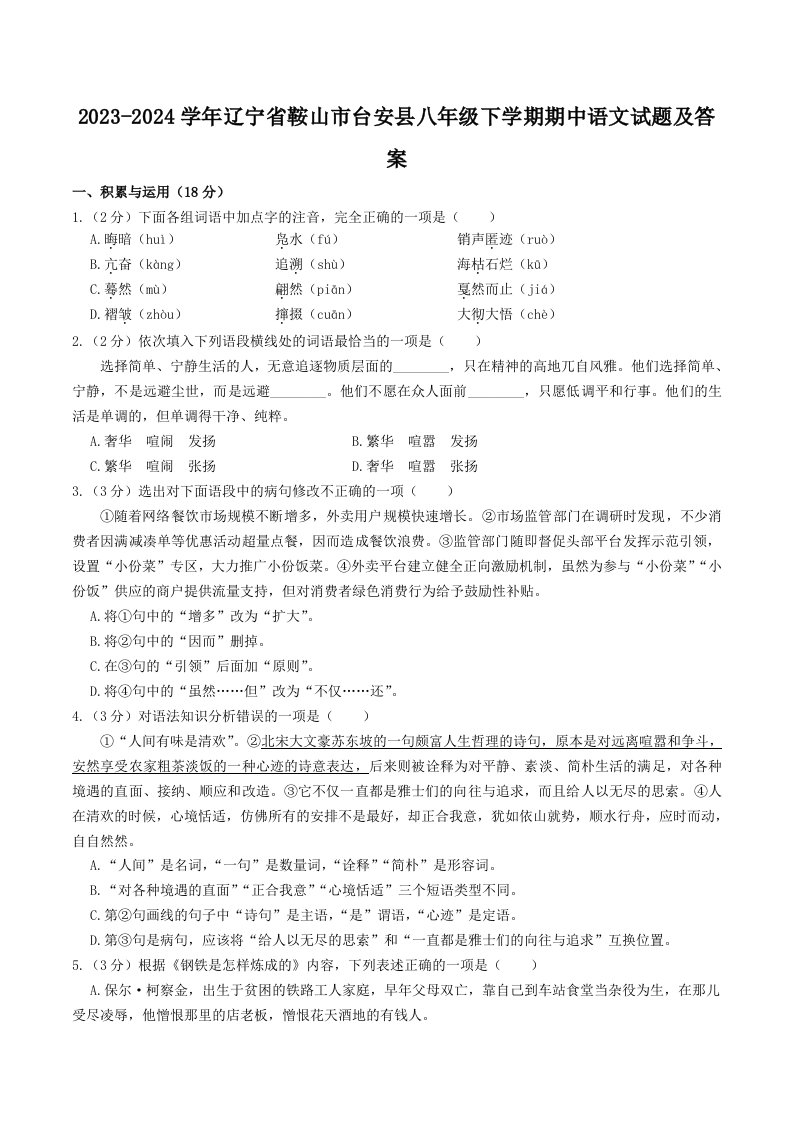 当前位置: 首页初中资源初中八年级正文 2023-2024学年辽宁省鞍山市台安县八年级下学期期中语文试题及答案(Word版)_共9页 初中八年级 4 天前 0 0 5 以上为部分内容预览,如需源文档请登录您的会员账号进行下载! 声明:本站所有文章,如无特殊说明或标注,均为本站原创发布。任何个人或组织,在未征得本站同意时,禁止复制、盗用、采集、发布本站内容到任何网站、书籍等各类媒体平台。如若本站内容侵犯了原著者的合法权益,可联系我们进行处理。 尚学资源永久会员 打赏 收藏 海报 链接