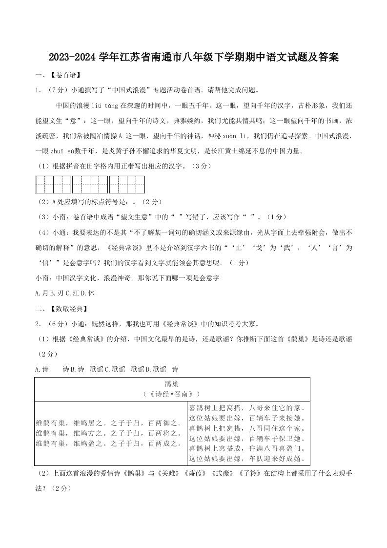 2023-2024学年江苏省南通市八年级下学期期中语文试题及答案(Word版)_共12页