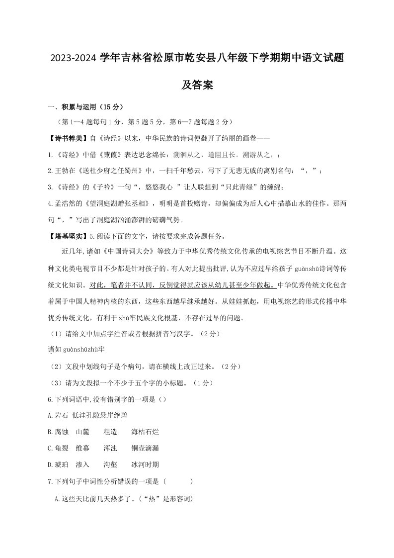 当前位置: 首页初中资源初中八年级正文 2023-2024学年吉林省松原市乾安县八年级下学期期中语文试题及答案(Word版)_共11页 初中八年级 4 天前 0 0 10 以上为部分内容预览,如需源文档请登录您的会员账号进行下载! 声明:本站所有文章,如无特殊说明或标注,均为本站原创发布。任何个人或组织,在未征得本站同意时,禁止复制、盗用、采集、发布本站内容到任何网站、书籍等各类媒体平台。如若本站内容侵犯了原著者的合法权益,可联系我们进行处理。 尚学资源永久会员 打赏 收藏 海报 链接