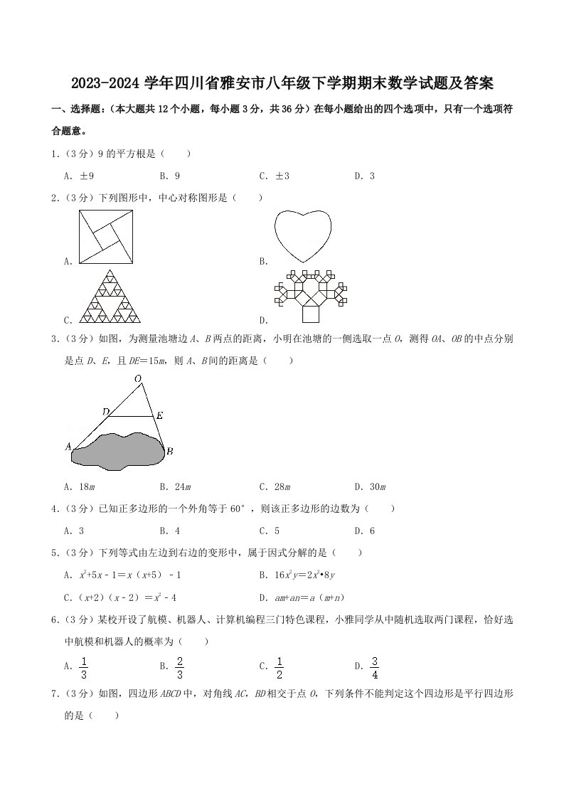 当前位置: 首页初中资源初中八年级正文 2023-2024学年四川省雅安市八年级下学期期末数学试题及答案(Word版)_共23页 初中八年级 4 天前 0 0 15 以上为部分内容预览,如需源文档请登录您的会员账号进行下载! 声明:本站所有文章,如无特殊说明或标注,均为本站原创发布。任何个人或组织,在未征得本站同意时,禁止复制、盗用、采集、发布本站内容到任何网站、书籍等各类媒体平台。如若本站内容侵犯了原著者的合法权益,可联系我们进行处理。 尚学资源永久会员 打赏 收藏 海报 链接