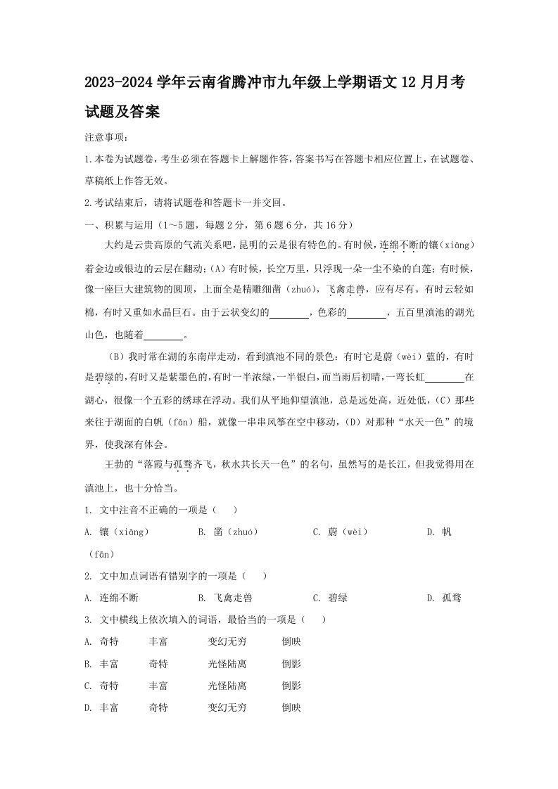 当前位置: 首页初中资源初中九年级正文 2023-2024学年云南省腾冲市九年级上学期语文12月月考试题及答案(Word版)_共21页 初中九年级 4 天前 0 0 15 以上为部分内容预览,如需源文档请登录您的会员账号进行下载! 声明:本站所有文章,如无特殊说明或标注,均为本站原创发布。任何个人或组织,在未征得本站同意时,禁止复制、盗用、采集、发布本站内容到任何网站、书籍等各类媒体平台。如若本站内容侵犯了原著者的合法权益,可联系我们进行处理。 尚学资源永久会员 打赏 收藏 海报 链接