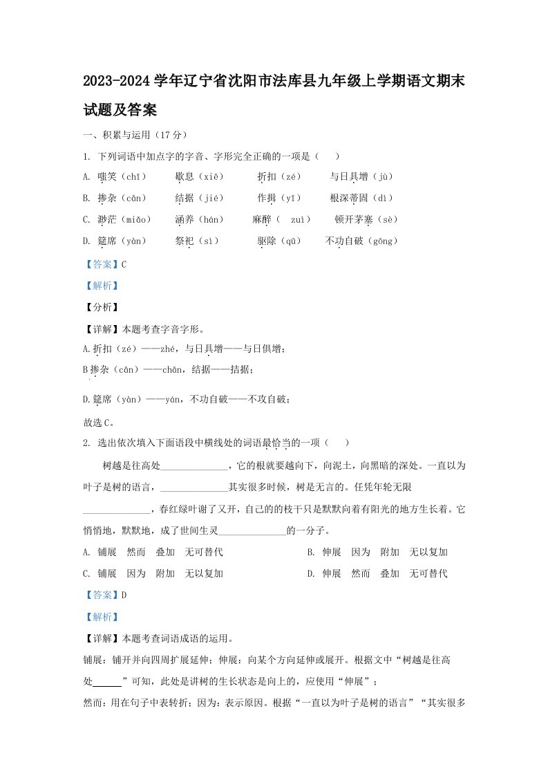 2023-2024学年辽宁省沈阳市法库县九年级上学期语文期末试题及答案(Word版)_共21页
