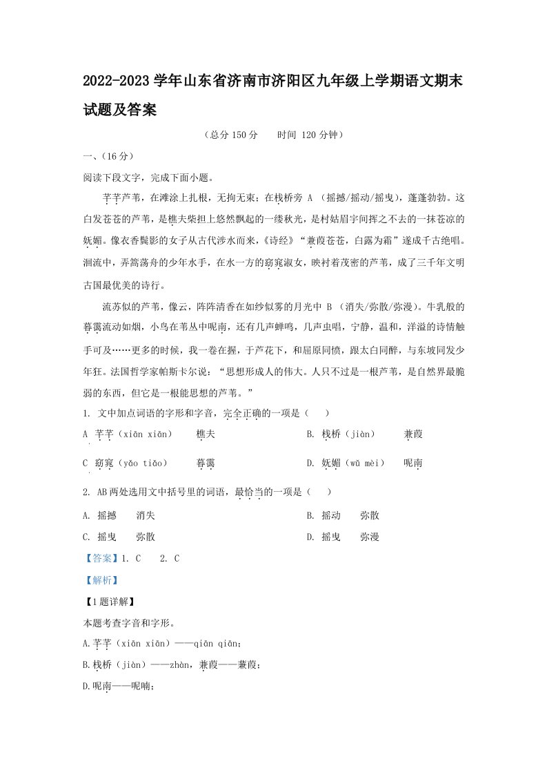 当前位置: 首页初中资源初中九年级正文 2022-2023学年山东省济南市济阳区九年级上学期语文期末试题及答案(Word版)_共21页 初中九年级 4 天前 0 0 15 以上为部分内容预览,如需源文档请登录您的会员账号进行下载! 声明:本站所有文章,如无特殊说明或标注,均为本站原创发布。任何个人或组织,在未征得本站同意时,禁止复制、盗用、采集、发布本站内容到任何网站、书籍等各类媒体平台。如若本站内容侵犯了原著者的合法权益,可联系我们进行处理。 尚学资源永久会员 打赏 收藏 海报 链接