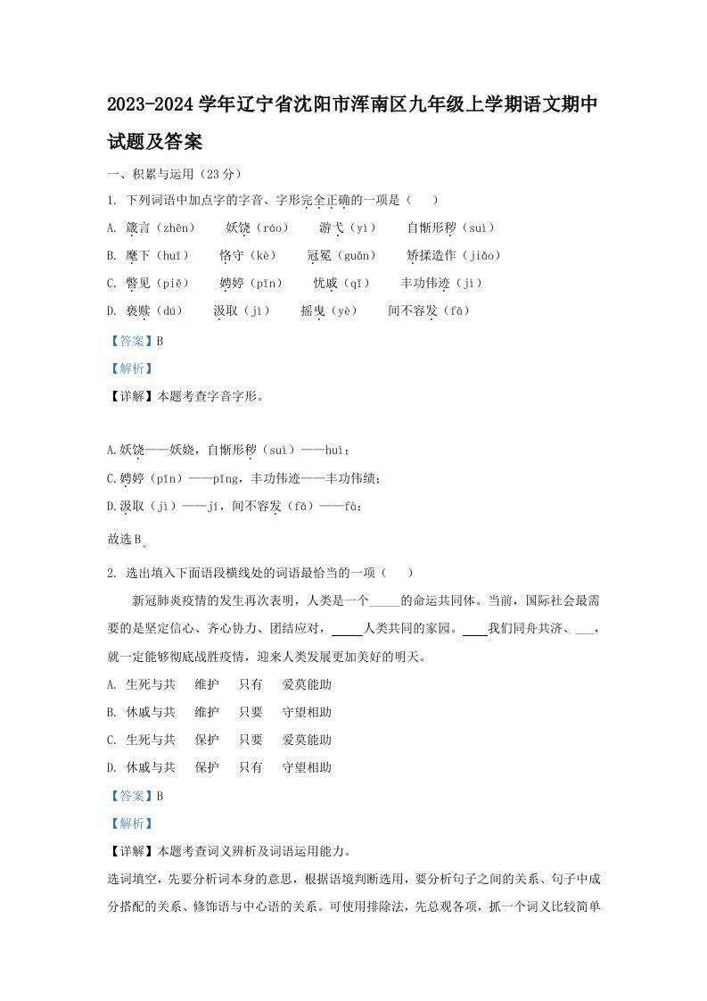 2023-2024学年辽宁省沈阳市浑南区九年级上学期语文期中试题及答案(Word版)_共23页