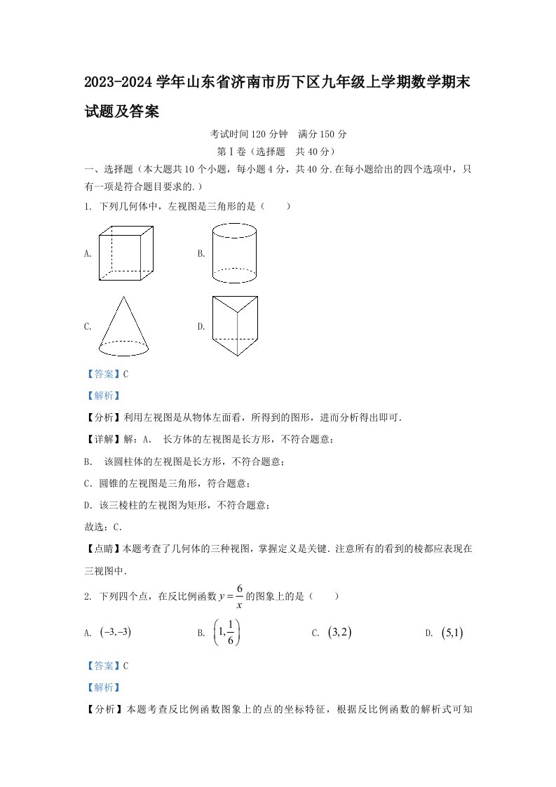 2023-2024学年山东省济南市历下区九年级上学期数学期末试题及答案(Word版)_共32页